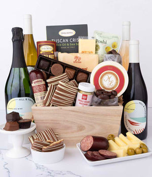 Elevate your gifting with this curated selection of premium Hill & Harbor California wines paired with an expertly chosen collection of artisan provisions. The basket brings together aged cheeses, house-made summer sausage, whole grain mustard, gourmet crackers, and luxury chocolate confections—each element selected to complement the wines and create a sophisticated tasting experience. Ideal for marking significant moments, from anniversaries to milestone celebrations, this thoughtfully assembled gift delivers both refinement and indulgence.