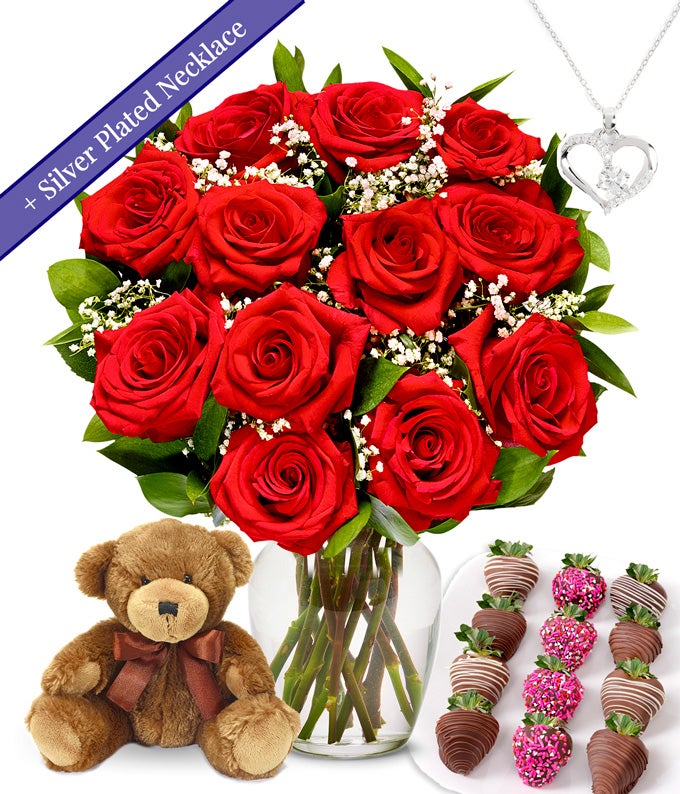 A dozen red roses, coupled with chocolate-covered Valentine strawberries, a heart necklace, and a keepsake teddy bear, form a charming and romantic gift ensemble. This thoughtful combination weaves together the classic beauty of roses, the decadence of chocolate-covered strawberries, a touch of elegance with a heart necklace, and the lasting affection symbolized by a keepsake teddy bear. Perfect for expressing love on Valentine's Day, this bundle creates a sensory and sentimental experience that captures the essence of affectionate moments.