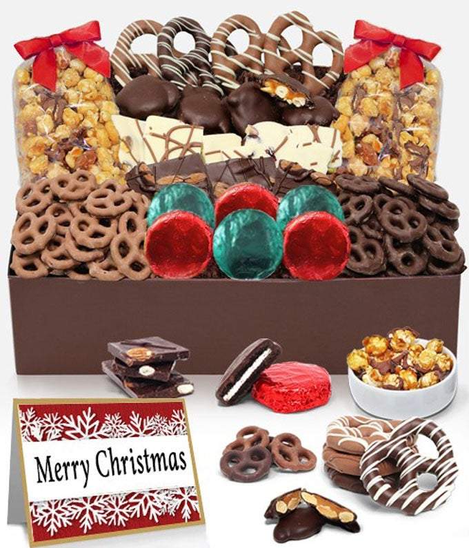 3. Crunch Time Snack Crate: This Christmas treat basket is overflowing with goodies! From chocolate covered Oreos to caramel popcorn, chocolate covered nuts and more. All of these snacks are delivered in a crate and topped with red ribbon.