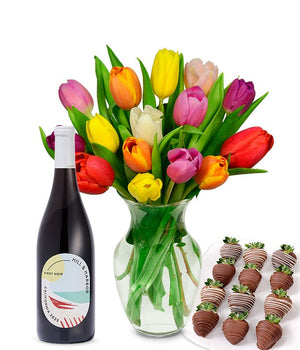 This vibrant tulip arrangement paired with a bottle of Hill & Harbor Pinot Noir and chocolate strawberries offers a fresh twist on classic gifting. Perfect for birthdays, congratulations, or just because moments. The colorful tulips bring energy while the wine adds depth. A fun yet refined gift option. Delivered in a gift box straight to the recipient's doors. Flowers are delivered arranged and wrapped securely. Blooms may take 2-3 days to open up, as shown in product photo.