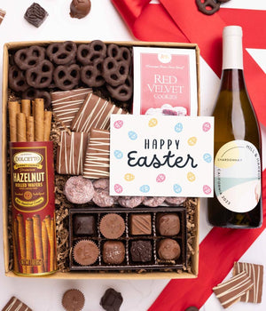 Make Easter a little sweeter with this delightful gift set, perfect for chocolate and wine lovers. Featuring two bottles of Hill & Harbor wine - Chardonnay and Pinot Noir, a box of assorted chocolates, crunchy chocolate-covered pretzels, chocolate-covered graham crackers, red velvet cookies, and hazelnut wafer rolls, this treat-filled bundle is great for sharing or indulging. Whether you're celebrating with family or sending a thoughtful gift, this box is sure to bring joy this Easter.