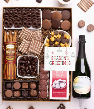 Spread holiday cheer with this festive gift set of Hill & Harbor Sparkling Wine and delectable chocolate treats. Featuring chocolate-covered pretzels, rich assorted chocolates, caramel popcorn, red velvet cookies, hazelnut wafer rolls, chocolate almonds, chocolate covered graham crackers, and chocolate-covered Oreos, it’s a sparkling way to celebrate the season with loved ones or colleagues.