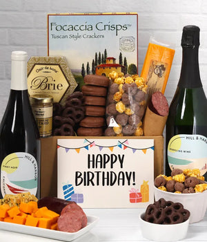Toast to their special day with this gourmet gift set featuring Hill & Harbor California Pinot Noir and Sparkling Wine, artisan focaccia crisps, creamy brie cheese spread, smokey cheddar, mustard, and summer sausage. Sweet treats like caramel popcorn, chocolate-covered pretzels, six chocolate-covered Oreos, and a birthday card add a celebratory touch to this perfect birthday surprise.