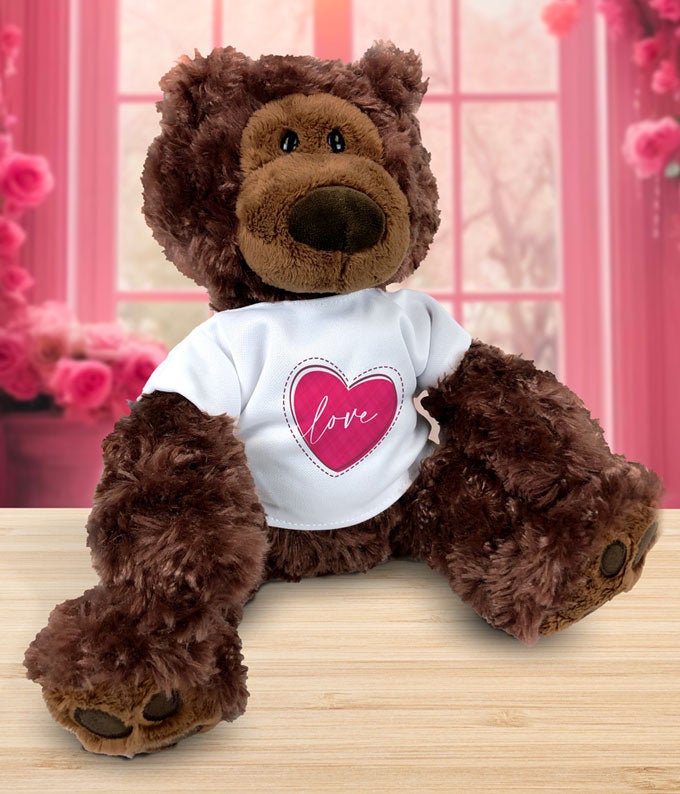 Share a heartfelt hug with this adorable plush teddy bear, designed to brighten any day. Made from soft, cuddly fabric, this lovable bear wears a white T-shirt featuring a pink heart and the word love for a sweet, simple message. Perfect for Valentine’s Day, anniversaries, or just because, it’s a comforting keepsake that delivers warmth, affection, and smiles long after it’s gifted.