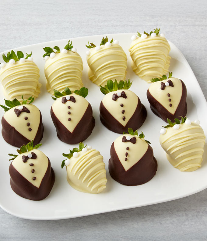 Send a wedding themed gift basket to a couple that just got engaged or to a couple that recently was married. These playful wedding gift baskets for delivery include chocolate covered strawberries that are decorated to look like a bride and groom. These wedding baskets delivered are a delicious gift to send to a couple on their honeymoon to enjoy.